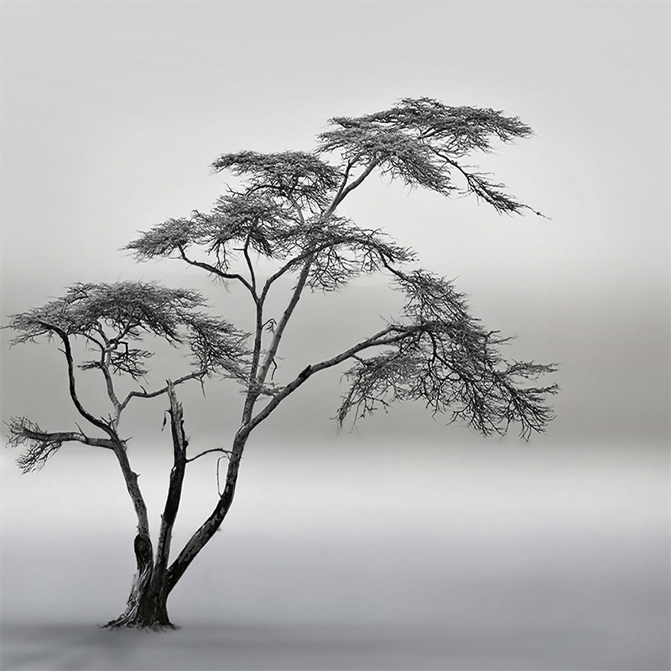 Ein einsamer Baum steht als Silhouette im dichten Nebel über der Savanne in Naivasha, Kenia. Die monochrome Stimmung fängt die Stille, die Tiefe und die offene Landschaft ein, in der Zeit und Distanz verschmelzen. Das Foto „a very long story“ wurde von Piet Flour geschaffen und strahlt Ruhe, Poesie und Nachdenklichkeit aus. Ein Bild von Sehnsucht, Weite und unendlichem Horizont.