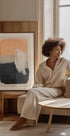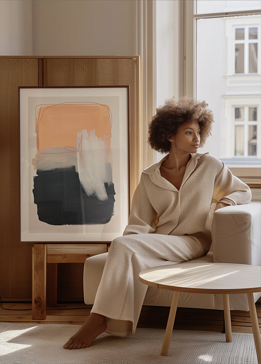 Ein modernes abstraktes Poster mit kräftigen Pinselstrichen in warmem Pfirsich, geschichtetem Grau, tiefem Schwarz und einem Hauch sanftem Weiß. Die strukturierten Striche und kontrastierenden Farbtöne schaffen eine markante Komposition, die Wärme und Tiefe in Einklang bringt – perfekt für minimalistische Innenräume, skandinavisches Dekor oder stilvolle Galeriewände.