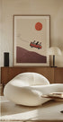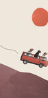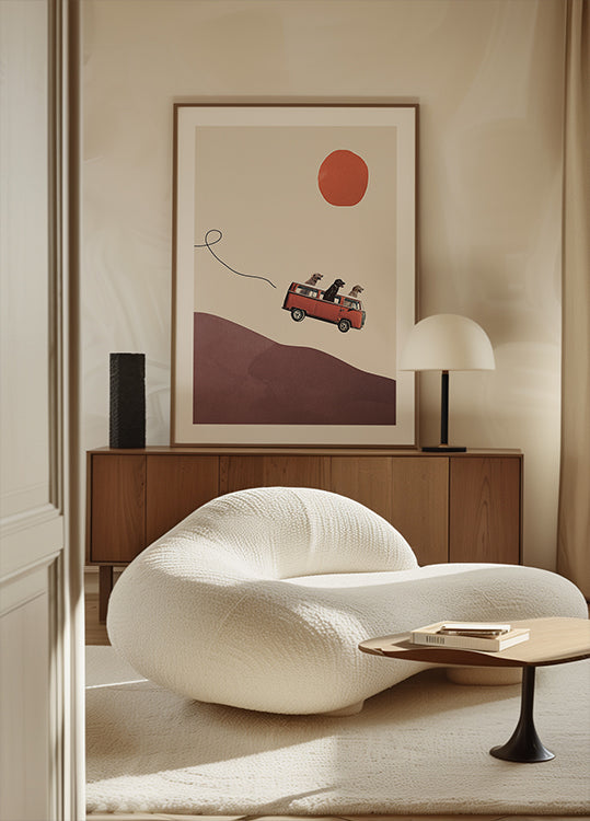 Ein verspieltes und humorvolles Poster mit Hunden, die bei starker Sonne einen roten VW-Bus über sanfte Hügel fahren. Mit seinem skurrilen Collage-Stil, dem Retro-Flair und den lustigen Ausdrücken fängt das Kunstwerk den Geist von Freiheit, Abenteuer und Freundschaft ein.
