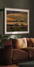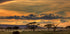Ein atemberaubendes Poster der afrikanischen Savanne bei Sonnenuntergang mit goldenem Himmel, vereinzelten Wolken und majestätisch über den nebligen Ebenen aufragenden Akazienbäumen. Im Vordergrund grast ein Elefant und fängt die raue Schönheit der Tierwelt und Natur Tansanias ein. Perfekt für Safari- und Landschaftsliebhaber.