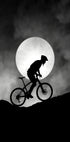 Ein kraftvolles Schwarz-Weiß-Silhouettenbild eines Radfahrers, der bei hellem Vollmond bergauf fährt. Der dramatische Kontrast zwischen Licht und Schatten schafft eine surreale und abenteuerliche Szene, die den Nervenkitzel des Nachtreitens, die Entschlossenheit und Ausdauer vor dem Hintergrund der Natur einfängt.