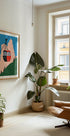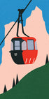 Eine kühne und verspielte grafische Illustration einer roten Seilbahn, die durch die Alpen gleitet. Mit klaren Linien, flachen Farben und einer Retro-Reiseästhetik fängt das Werk die Freude am Bergabenteuer und den zeitlosen Charme des Hochgebirgstransports in einem modernen, künstlerischen Stil ein.