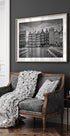 Eine ikonische Schwarz-Weiß-Darstellung des Amsterdamer Damrak: Die berühmten tanzenden Häuser stehen in grafischem Rhythmus entlang des Kanals, mit Spiegelungen im ruhigen Wasser und dramatischen Wolken über der Stadt. Melanie Viola fängt die historische Fassade und den urbanen Puls in einem zeitlosen Motiv ein, perfekt für die moderne, nordische Innenarchitektur im Zuhause.
