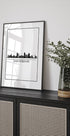 Ein elegantes, minimalistisches Motiv der Skyline von Amsterdam: Grachtenhäuser mit Stufengiebeln, schlanke Brücken und eine klassische Windmühle, gezeichnet in klaren Linien vor einem ruhigen, dunklen Nachthimmel. Dezente Kontraste und wenige, grafische Details sorgen für einen modernen Look. Erstellt von der Künstlerin Kristina N. (SoulArt Shop). Perfekt für Liebhaber der Stadt und des nordischen Minimalismus.
