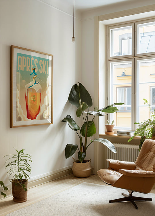 Ein verspieltes Après-Ski-Poster, das einen Skifahrer zeigt, der ein schaumiges Bierglas hinunterrast, eine Mischung aus alpinem Abenteuer und Après-Ski-Feier. Mit kräftigen Farben und humorvollen Illustrationen fängt das Kunstwerk die Freude am Wintersport, festliche Getränke und die lebhafte Atmosphäre des Bergurlaubs ein.