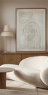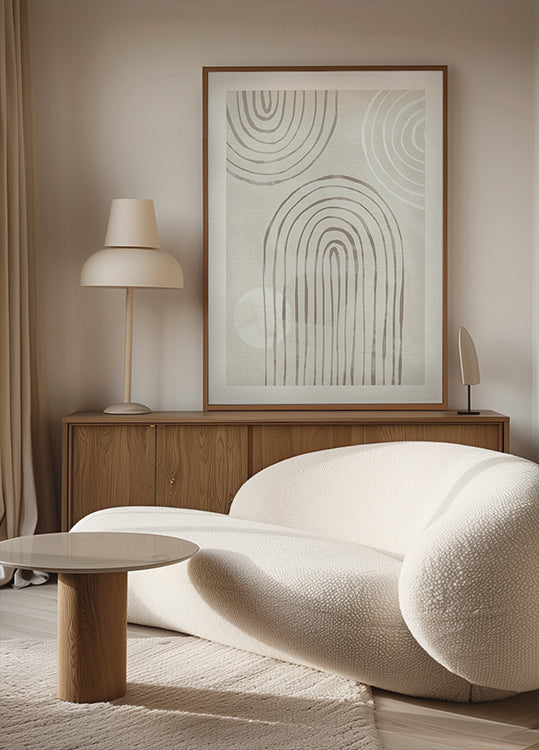 Ein handgezeichnetes abstraktes Poster mit organisch geschwungenen Linien und kreisförmigen Mustern in sanften Beigetönen. Die unvollkommene, fließende Geometrie verleiht Wärme und Textur und verleiht dem Kunstwerk eine natürliche und künstlerische Note. Perfekt für minimalistische, japanisch und skandinavisch inspirierte Innenräume.