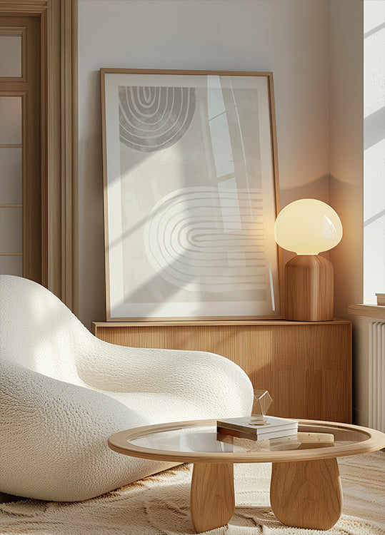 Ein beruhigendes, minimalistisches Poster mit zwei handgezeichneten Schleifen in sanften Beige- und Weißtönen. Die organischen Formen und die ruhige Symmetrie schaffen eine ausgewogene Komposition, ideal für japanische, skandinavische oder moderne Innenräume.