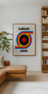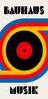 Ein auffälliges, vom Bauhaus inspiriertes Musikplakat mit einer stilisierten schwarzen Schallplatte mit dynamischen roten, gelben und blauen geometrischen Linien. Dieses retromoderne Kunstwerk zelebriert Musik, Rhythmus und Design im Geiste des Bauhaus-Minimalismus. Perfekte Wandkunst für Musikliebhaber, Plattensammler und moderne Innenräume.