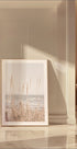 Ein sanftes Küstenfoto mit hohen Strohhalmen, die an der Küste schwanken, mit dem Meer im Hintergrund. Die natürlichen Beigetöne und der ruhige Horizont schaffen eine entspannte Atmosphäre, ideal für ruhige, von der Natur inspirierte Innenräume.