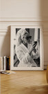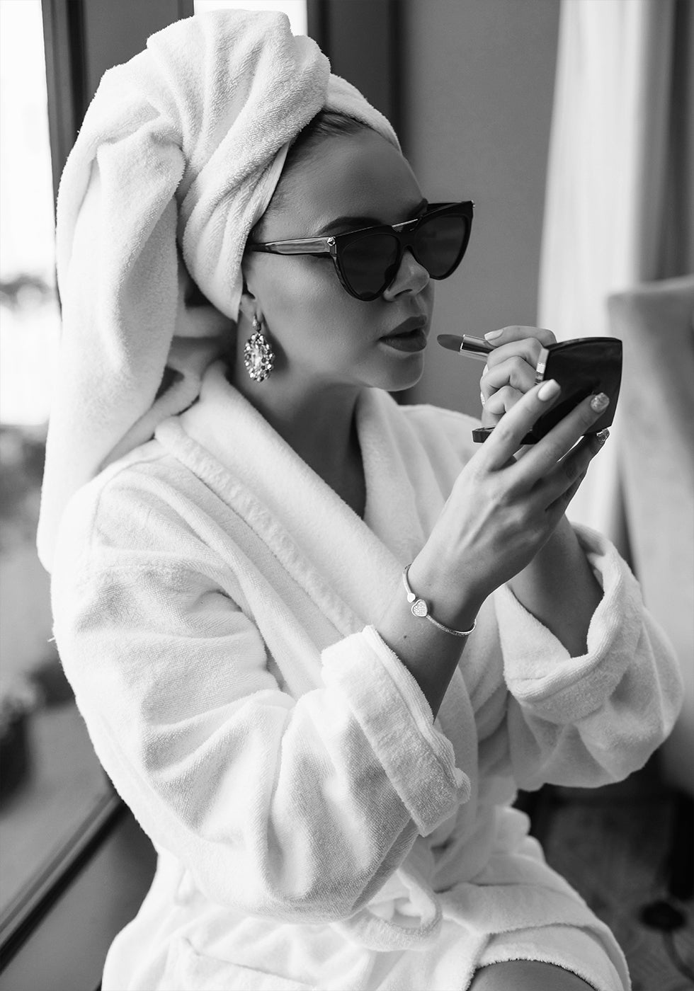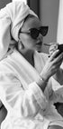 Ein raffiniertes Schwarz-Weiß-Foto einer Frau im Bademantel mit einem Handtuch um den Kopf, die Lippenstift aufträgt, Sonnenbrille und Statement-Schmuck trägt. Dieses elegante Kunstwerk zelebriert die Schönheit kleiner Rituale und zeitlosen Glamour und eignet sich perfekt für modeinspirierte Innenräume.