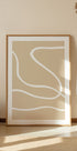 Ein beruhigendes, minimalistisches Poster mit fließenden weißen Linien auf beigem Hintergrund. Die abstrakte Komposition strahlt Schlichtheit, Harmonie und Eleganz aus und macht sie zu einem zeitlosen Stück für moderne Innenräume.
