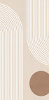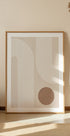 Ein moderner, minimalistischer Kunstdruck mit sanften Beigetönen, klaren weißen Bögen und einem geometrischen Kreis. Das schlichte Design, inspiriert von der Mid-Century-Moderne, verleiht jeder Wand Ausgewogenheit und Eleganz und eignet sich perfekt für neutrale Innenräume und Räume im Bohemian-Stil.