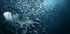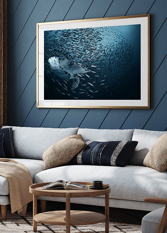 Ein atemberaubendes Unterwasserposter mit einer Meeresschildkröte, die durch einen wirbelnden Fischschwarm im tiefblauen Meer gleitet. Dieses Motiv wurde auf den Similan-Inseln in Thailand aufgenommen und fängt die Schönheit und das Chaos des Meereslebens ein.