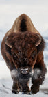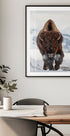 Ein kraftvolles Naturfoto eines Bisons, der durch den Schnee stürmt. Mit frostigem Atem und Schnee auf dem Gesicht fängt dieses dramatische Bild die rohe Kraft, Ausdauer und majestätische Präsenz eines der berühmtesten Tiere Nordamerikas ein.