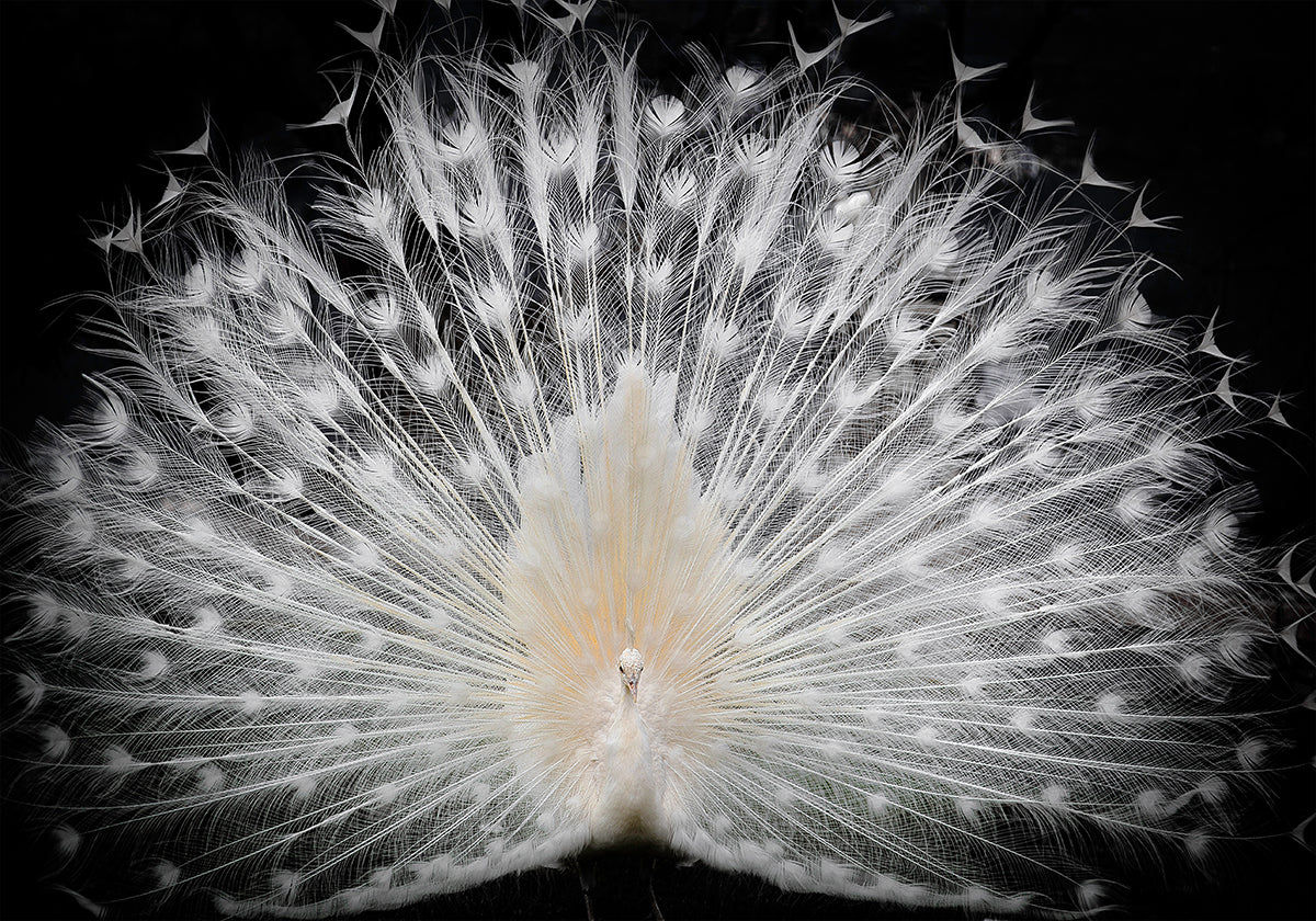 Ein atemberaubendes Foto eines seltenen weißen Pfaus, dessen Federn vollständig ausgebreitet sind und ein kompliziertes und zartes Muster purer Eleganz bilden. Dieses auffällige Kunstwerk symbolisiert Schönheit, Anmut und Seltenheit und wird zu einem faszinierenden Mittelpunkt in jeder Einrichtung.
