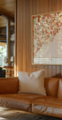 Black Maps Earth Tones 89 by Emiliano Deificus is a moody cartographic artwork: a deep black base layered with warm clay, sand, and ochre tones tracing urban grids and coastlines. Subtle textures and bold contrasts evoke North American city life—calm, modern, and richly atmospheric on any wall. A striking focal point for maps and design lovers.
