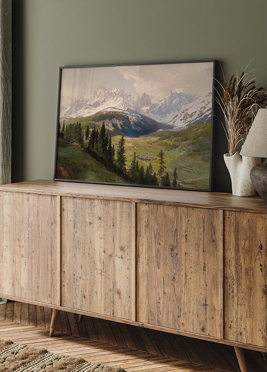 „Blick vom Berg Helm“ von Konrad Petrides präsentiert eine herrliche Aussicht auf ein ruhiges Alpental, umgeben von majestätischen, schneebedeckten Gipfeln. Fichtenwälder bedecken die Hügel und eine einsame Holzhütte liegt ruhig inmitten der grünen Landschaft. Die Sonne beleuchtet sanft das weite Tal darunter, wo man gewundene Pfade und in der Ferne Dorfhäuser sehen kann. Diese idyllische Szene fängt die zeitlose Schönheit der Berge ein.