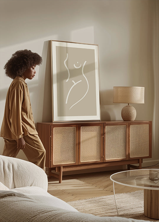 Eine elegante Strichzeichnung in warmen Sandtönen zeichnet die weibliche Figur mit anmutigen, fließenden Konturen nach. Minimale Formen und großzügiger Negativraum schaffen eine ruhige, moderne Stimmung, während weiche Schatten für Tiefe sorgen. Diese subtile und dennoch ausdrucksstarke Körperskizze verleiht zeitgenössischen Innenräumen mühelose Raffinesse. In neutralem Beige passt es zu jeder Palette.