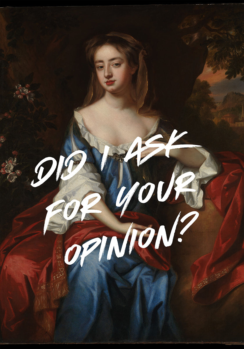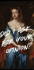 Dieses humorvolle Poster kombiniert ein raffiniertes Barockporträt mit kräftigem handgeschriebenem Text: „Habe ich Sie um Ihre Meinung gebeten?“. Das Zusammenspiel von Vintage-Eleganz und moderner Satire schafft ein humorvolles, rebellisches Statement, perfekt, um jeder Wand Persönlichkeit und Eleganz zu verleihen.