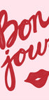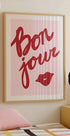 Ein verspieltes und stilvolles Typografie-Poster mit dem französischen Wort Bonjour und eine Illustration roter Lippen auf einem zartrosa Hintergrund. Perfekt für moderne Innenräume und verleiht der Wanddekoration eine feminine und elegante Atmosphäre.
