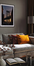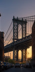 Ein atemberaubender Blick auf die Manhattan Bridge in Brooklyn, New York, aufgenommen bei Sonnenuntergang mit dem perfekt zwischen den Stahlbögen eingerahmten Empire State Building. Dieses ikonische Stadtposter unterstreicht die architektonische Schönheit und die urbane Atmosphäre von NYC und macht es zu einem Muss für Reisende und moderne Wohnkultur.