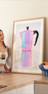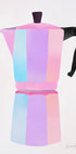 Eine pastellfarbene Illustration einer klassischen italienischen Mokkakanne in sanften Rosa-, Blau- und Lavendelfarben vor einem minimalistischen weißen Hintergrund. Das Stück zelebriert Morgenrituale und Kaffeekultur in einem frischen, modernen Stil, perfekt, um die Küche aufzuhellen und ihr eine verspielte und dennoch elegante Note zu verleihen.
