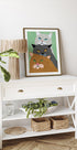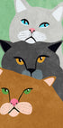 Eine kühne und moderne Illustration von drei stilisierten Katzen, die in einem verspielten Porträt gestapelt sind. Mit ausdrucksstarken Schnurrhaaren, lebendigen Augen und einem farbenfrohen Grafikdesign ist dieses Kunstwerk perfekt für Katzenliebhaber und verleiht jedem Raum eine skurrile, moderne Atmosphäre.