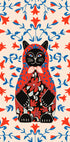 Eine verspielte und farbenfrohe Illustration einer lächelnden Katze im Design einer russischen Matroschka-Puppe, verziert mit roten und blauen Blumen. Perfekt für Kinderzimmer, charmante Innenräume oder für alle, die skurrile Katzenkunst mit fröhlichem Ausdruck lieben.