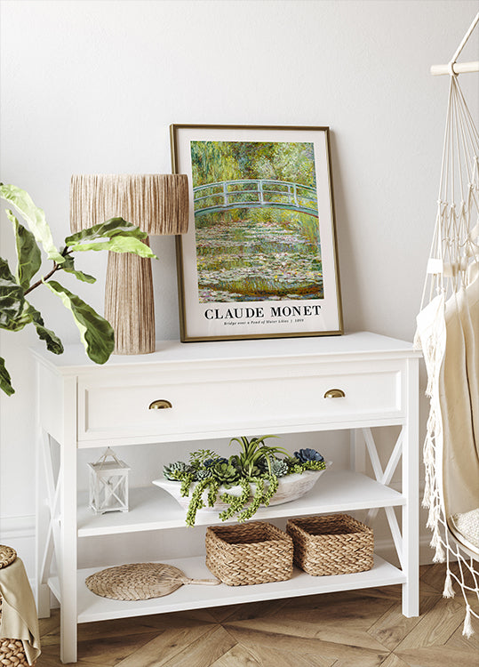Ein atemberaubendes impressionistisches Meisterwerk von Claude Monet aus dem Jahr 1899. Das Kunstwerk zeigt die ruhige Schönheit von Monets japanischer Brücke in seinem Garten in Giverny, umgeben von üppigem Grün und schwimmenden Seerosen. Die lebendigen Pinselstriche und die sanfte Farbpalette schaffen eine verträumte, ruhige Atmosphäre, perfekt für Naturliebhaber und Bewunderer klassischer Kunst.