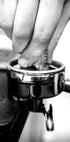 Ein auffälliges Schwarz-Weiß-Kaffeeposter mit einer Nahaufnahme der Hand eines Baristas, die frisch gemahlenen Kaffee in einen Siebträger drückt. Dieses minimalistische, monochrome Design ist perfekt für Kaffeeliebhaber, Cafés und Küchenwände und fängt das Handwerk der Espressozubereitung ein.