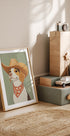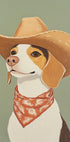 Ein verspieltes und charmantes Kunstwerk eines als Cowboy gekleideten Beagle-Hundes mit breitem Hut und gemustertem Kopftuch. Dieses humorvolle Tierporträt kombiniert rustikalen Westernstil mit leichtem Humor – perfekt für Hundeliebhaber und skurrile Wandkunstsammlungen.