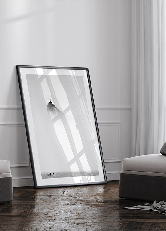 Ein ruhiges Schwarz-Weiß-Foto, das die berühmte Christus-Erlöser-Statue in Rio de Janeiro einfängt, die majestätisch über dem Nebel steht. Die dunstige Atmosphäre schafft eine spirituelle und kontemplative Atmosphäre, während ein kleines Ruderboot auf dem Wasser die Größe und Tiefe der Szene betont. Ein zeitloses Werk, das Monumentalität mit Gelassenheit verbindet, perfekt für Liebhaber religiöser, architektonischer und minimalistischer Fotografie.