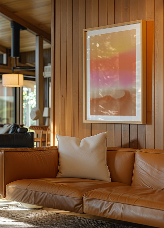 Diese verträumte abstrakte Landschaft von Dina Dankers vereint Dünen, Felder und Himmel in samtigen Streifen aus Pastell und Neon. Sandfarbene Beigetöne verschmelzen mit leuchtendem Orange und Zitronengelb, ein ruhiger Horizont leuchtet vor einem sanften, leuchtenden Himmel – minimalistisch, modern und unwiderstehlich transportierend. Hinweise auf einen fernen Weg laden zum Innehalten und Lassen ein.