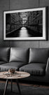 Eine dramatische, monochrome Reise durch das Hamburger Grachtenviertel: Backsteinfassaden und eine niedrige Brücke lenken den Blick Richtung Horizont, während stilles Wasser Licht und Schatten reflektiert. Stefan Eisele fängt die kühle Ruhe der Stadt mit straffen Linien, Symmetrie und Tiefe ein – ein urbanes Motiv, das zum Nachdenken einlädt. Das Motiv ist eine Hommage an die zeitlose Geometrie der Speicherstadt.