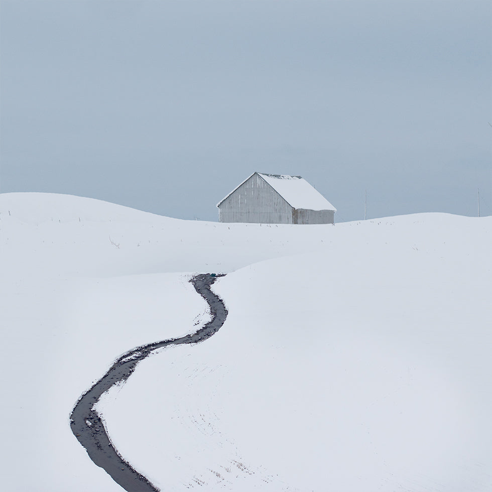 Ein ruhiger Wintertag entfaltet sich in einer verschneiten Landschaft: eine einsame Hütte an einem stillen Bach, die Zweige der Fichten schwer vom Frost und der Himmel in sanften, blassen Farbtönen. The Cabin von Xiang Wei fängt die Ruhe, die Kälte und die klare Luft ein – ein Motiv, das mit Reflexion nordischen Minimalismus und eindringliche Stille in den Raum bringt.