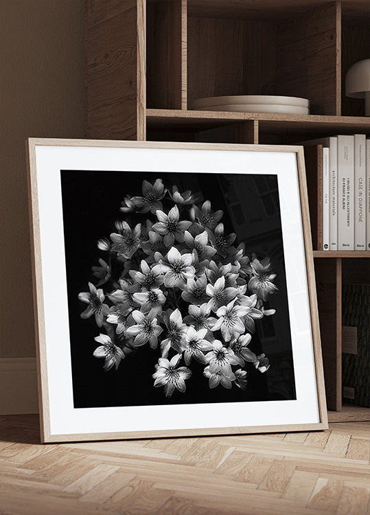 Early Sensation von Yvette Depaepe – ein eindrucksvolles, monochromes Stillleben, in dem zarte Clematisblüten vor einem dunklen, zurückhaltenden Hintergrund hervortreten. Die feinen Blütenblätter vereinen sich zu einem poetischen Bouquet mit scharfem Kontrast und harmonischem Rhythmus – eine Hommage an die botanische Schönheit und das stille Versprechen des Frühlings. Ein zeitloser Hingucker.