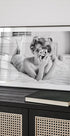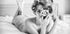Ein stilvolles Schwarz-Weiß-Poster, das ein Retro-inspiriertes Porträt einer Frau mit Vintage-Haarlocken einfängt, die elegant auf einem Bett liegt und eine klassische Kamera in der Hand hält. Mit einer Mischung aus Sinnlichkeit, Nostalgie und künstlerischem Ausdruck zelebriert die Fotografie weibliche Anziehungskraft und zeitlosen Glamour.
