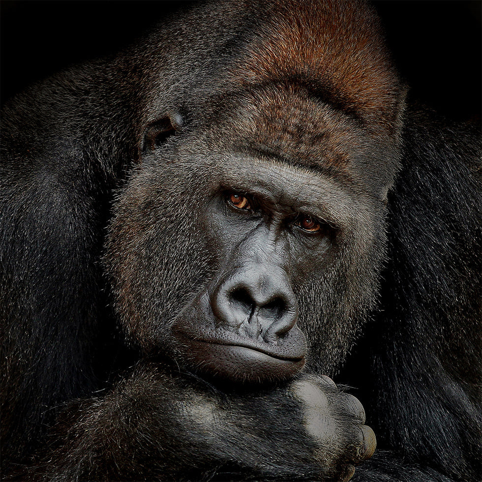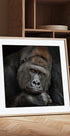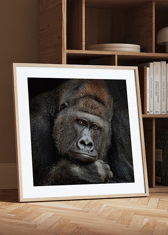 Ein intensives, zurückhaltendes Porträtposter eines majestätischen Silberrückengorillas, eingefangen in einem Moment stiller Kontemplation. Der tiefe, weise Blick trifft deinen und schafft gleichzeitig Präsenz, Verletzlichkeit und Stärke. Die Schatten heben die Besonderheiten hervor und verleihen dem Motiv eine zeitlose, skulpturale Ruhe. Von Antje Wenner-Braun. Der Titel lautet ONE MOMENT IN CONTACT.