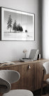 „A Sunny Winter Day“ von Steven Zhou zeigt eine helle, schwarz-weiße Winterlandschaft. Die Sonne glitzert im Schnee und Raureif, während Gänse an einer einsamen Scheune und einem Bauernhaus vorbeiziehen. Die kahlen Bäume und die klare Luft schaffen eine ruhige, ländliche Atmosphäre mit zeitloser Eleganz und nordischer Kälte. Eine kontrastreiche Optik verleiht dem Motiv eine moderne, grafische Ruhe.