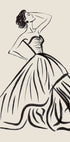 Eine anmutige Strichzeichnung einer Frau in einem fließenden Kleid, eingefangen in einer zeitlosen und stilvollen Pose. Die minimalistischen schwarzen Linien auf einem sanften beigen Hintergrund verleihen dem Kunstwerk eine schicke Modeillustrations-Atmosphäre – perfekt für Kleiderschränke, Studios oder moderne Galeriewände.