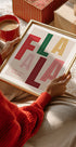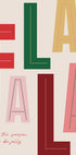 Sing it out: Fa La La in jubilant, stacked type bursts across the page in holly red, pine green, berry pink and golden accents. This playful typographic design channels the classic carol, bringing modern, festive energy to hallways, mantels and gallery walls—joyful, bright, unmistakably holiday. Let it sing on your wall.
