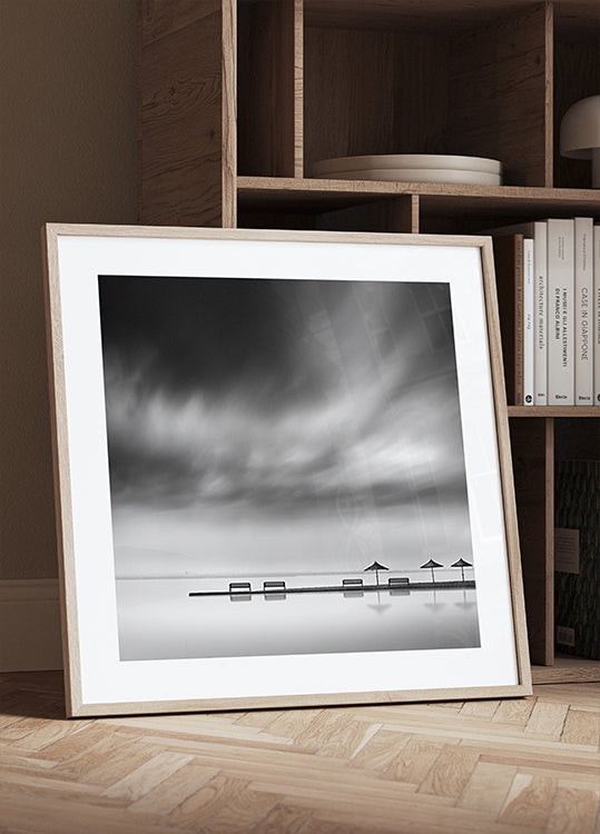 „Four Benches and three Umbrellas“ von George Digalakis ist eine poetische, monochrome Meditation am Wasser: Vier leere Bänke blicken auf ein spiegelndes Meer, während drei Sonnenschirme rhythmisch den Horizont markieren. Einfachheit, Symmetrie und ruhige Reflexion schaffen eine ruhige und grafische Ausgewogenheit im Raum. Perfekt für modernes, minimalistisches Dekor.