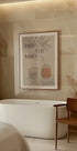 Diese beruhigende Illustration erinnert an einen ruhigen Moment tropischer Präsenz. Eine brennende Duftkerze mit ätherischen Ölen (Orange, Minze und Eukalyptus) steht neben einem erfrischenden Glas Saft, getaucht in sanfte Schatten von Palmblättern. Die Worte „Free Your Mind“ rufen zum Innehalten und zur Ruhe auf. Mit gedämpften Farben und einer minimalistischen Sommeratmosphäre strahlt das Poster eine Spa-ähnliche Ruhe aus – ideal für Räume, die Ruhe, Konzentration und natürliche Balance suchen.
