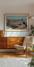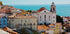 Fra Lissabon med kærlighed: En stemningsfuld plakat, der fanger byens farverige tage, hvide kirketårne og snævre gader, badet i sol under en klar, blå himmel. Blikket bevæger sig mod det glitrende hav i horisonten, og hele scenen emmer af middelhavscharme, rejsedrømme og tidløs feriestemning. En hyldest til byens vintage-postkortcharme.