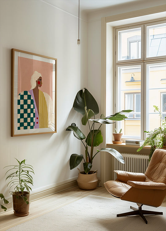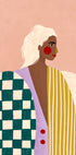Dieses abstrakte Kunstwerk zeigt ein stilisiertes Porträt einer Frau in einer auffälligen geometrischen Bluse mit leuchtenden Farben. Das Werk unterstreicht modernes Design, Minimalismus und künstlerischen Ausdruck mit ausdrucksstarken Formen vor einem gedämpften Hintergrund – perfekt für Liebhaber zeitgenössischer Kunst.