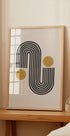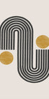 Ein modernes, minimalistisches, abstraktes Design mit kräftigen schwarzen geschwungenen Linien, die Bögen bilden, kombiniert mit goldenen Kreisformen auf einem einfachen Hintergrund. Dieses geometrische Kunstwerk kombiniert Retro-Ästhetik aus der Mitte des Jahrhunderts mit zeitgenössischem Stil und ist ein perfektes Statement für moderne Innenräume.