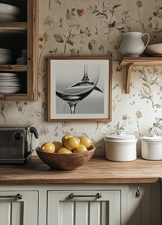 Zwei elegante Weingläser in Schwarz und Weiß bilden ein grafisches Stillleben, in dem sich weiche Kurven und scharfe Linien spiegeln. Ein Glas wird auf den Kopf gestellt, wodurch Spannung, Rhythmus und perfekte Symmetrie entstehen. Eine minimalistische, zeitlose Komposition für Küche, Bar oder Wohnzimmer mit einem Sinn für Ruhe und Ästhetik. Ein dezentes Statement an der Wand.