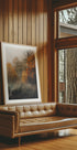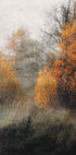 Ein malerischer Herbstwald, der in sanftem Nebel verschwindet, mit leuchtend orangefarbenen und bernsteinfarbenen Blättern, die sich vor gedämpften graugrünen Streifen abheben. Der strukturierte Stil verleiht einen verträumten und stimmungsvollen Ausdruck, der den ruhigen Übergang des Herbstes einfängt. Ein ruhiges Naturposter für eine warme Galeriewand.