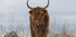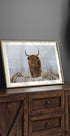 Ein majestätischer schottischer Highlander steht ruhig in einer verschneiten Landschaft, sein langes, braunes Fell ist mit Raureif bestäubt und seine Hörner heben sich grafisch vom weißen Horizont ab. Die gedämpfte Winterpalette und die neblige Kälte schaffen nordische Ruhe und ländliche Poesie. Das Foto stammt von Jaap van den Helm. Aufgenommen in Veluwezoom, Niederlande, und ideal für nordische, rustikale Einrichtung.
