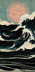 Ein dramatisches, japanisch inspiriertes Wellenkunstwerk im strukturierten Vintage-Stil. Die mächtigen Meereswellen steigen unter einer gedämpften Sonne auf, die traditionelle Kunst mit moderner Japandi-Ästhetik vereint. Perfekt für Liebhaber von Meereslandschaften und traditionellen Wellengemälden.